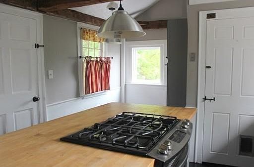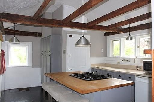 - Kit Dscrp: Flooring - Wood, Countertops - Stone/Granite/Solid, Ceiling - Cathedral, Kitchen Island, Fireplace, Ceiling - Beamed