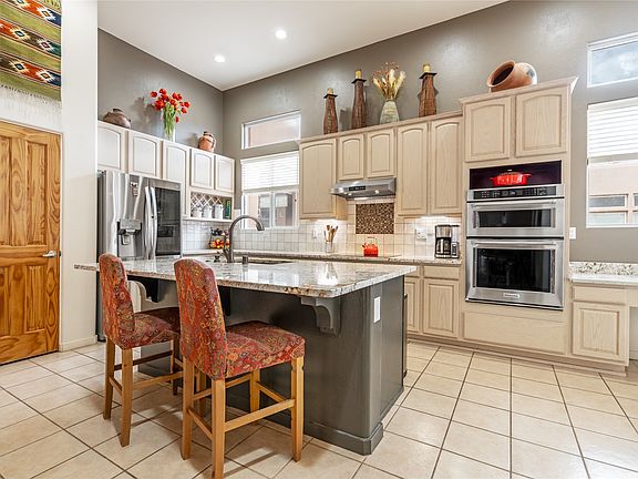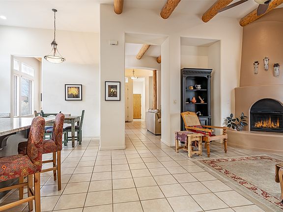 Outstanding single level home in highly desirable Rancho Viejo Village. Bright and open 5 bedroom home offers over 2700 square feet of living space perfect for today's buyer. There is an open living room/kitchen area with patio access, a gas kiva fireplace in the living room for a warm gathering of friends and family, and a bright spacious dining room adjacent to the comfortable den. 12 ft. high ceilings and wood vigas add southwestern charm. One side of the home features the primary suite with a gas kiva fireplace, access to the covered rear courtyard and a gorgeously remodeled bath with a dual sink vanity, superb lighting, elegant soaker tub, and tiled walk-in dual head shower, plus a extra large walk-in closet. On the opposite side of the home, the larger bedroom with it own private bath and utility sink makes the perfect light-filled art studio, office, or bonus room. Three other bedrooms offer a multitude of functions. The home also features new Driftwood ceramic tile floors throughout. The sunlit open kitchen has been beautifully upgraded with all new tile and accent backsplash, new granite countertops and large granite island with composite sink and disposal. All new Kitchen Aid and LG appliances include the dishwasher, combination wall oven/microwave, state of the art induction cooktop and see through door refrigerator. Other upgrades include a new cast iron boiler with in-floor radiant heat, a newer roof, plus a 2-car attached garage with extensive storage shelving. The corner lot has established landscaping and a generous wrap-around courtyard and is isolated from street traffic and other close in homes on a wonderful neighborly cul-de sac with views of the surrounding mountains and open space. Rancho Viejo is a wonderful planned urban community with dedicated open space offering over 15 miles of paved walking trails, many community parks, sensible covenants, and great neighbors.