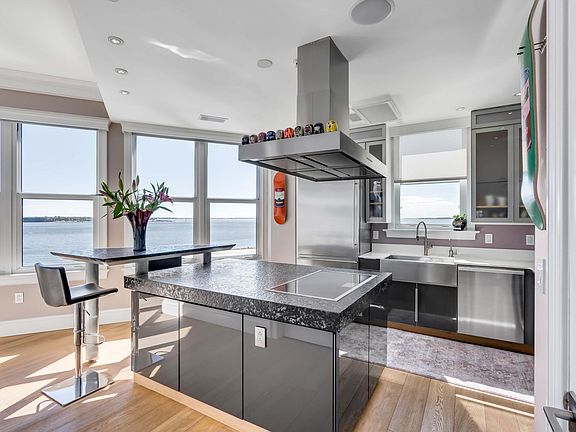 Welcome to 2 Wharfside 5-W, where luxury living and spectacular views come together. This Laurens Place penthouse offers unparalleled views of the Charleston Harbor, directly facing the Ravenel Bridge and Yorktown Naval Museum. Enter through your own private entrance into the light-filled, spacious unit. This 2 bedroom, 2.5 bathroom unit boasts only high-end finishes such as Gaggenau stove and ovens, and Miele dishwasher and laundry equipment. There are several outdoor living spaces to be enjoyed, capturing various vantage points of the city skyline. Other features include wide-plank European oak flooring, 10-foot ceiling heights, and contemporary LED lighting in kitchen, living room and primary suite. Motion sensor activated lights in common area and bathrooms.Speakers throughout. The window treatments are electric/remote controlled in the living room, kitchen, and primary bedroom. New energy efficient, impact glass has been installed. Originally a 3 bedroom condo, 5-W has been converted into a 2 bedroom. 5-W features 2 deeded, indoor garage parking spaces. There is a boat slip with lift available as a separate purchase. Experience the perfect blend of modern amenities and sophisticated design in a setting that is as inviting as it is breathtaking!