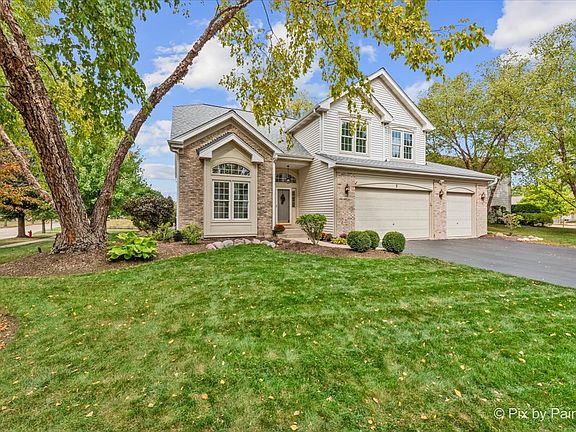 Welcome to 2 White Chapel Ct. - This stunning, desirable and rarely available "Madison" Model home offers 2,612 sq. ft. (above grade) of beautifully designed living space in the highly sought-after Willoughby Farms subdivision of Algonquin. Perfectly situated on a large, professionally landscaped corner lot with underground sprinklers, this 4-bedroom, 3-bath home (including a first-floor in-law/office/craft room with adjacent full bath) with 3 car garage combines timeless style, modern upgrades, and an outdoor oasis featuring your very own deck and in-ground heated pool. From the moment you arrive, the curb appeal is undeniable. With its strategically placed lights that subtly light up the beautiful landscaping at night accenting mature river birch trees, this home will impress from the start. Step inside to be greeted by a soaring two-story foyer and majestic staircase (highlighted by lit recessed built-ins ideal for displaying your favorite artwork or family treasures). Freshly painted and re-carpeted, every inch of this home radiates pride-of-ownership that sets the stage for the elegance found throughout. Off to your left is your formal living and dining areas with voluminous soaring ceilings and stained-glass windows providing the perfect spaces for entertaining and serving an incredible meal. At the heart of the home lies your gourmet kitchen - a true chef's delight with 42" maple-glazed cabinetry, dovetail self-closing drawers, granite countertops, stone tile backsplashes, under-cabinet lighting, and a large granite-topped island with added storage. Stainless steel KitchenAid professional series appliances, including a gas cooktop and separate convection oven, make preparing meals a joy. The spacious eat-in area provides casual dining with views of your private backyard retreat through sliding glass doors with built-in blinds. The kitchen flows seamlessly into the family room, where a cozy gas fireplace invites you to unwind after a long day. Nearby, a spacious laundry room with front-loading washer and dryer, sink, shelving, and hanging racks adds everyday convenience. Tucked away on the main level is your flexible office/in-law/guest room, adjacent to a full bath for true multi-generational living. A three-car garage with cabinets and an extended pad ensures plenty of room for vehicles, storage, and hobbies. Upstairs, retreat to your luxurious master suite sanctuary featuring a sitting room, vaulted ceiling, and spa-like en-suite. Pamper yourself with a whirlpool tub, separate stand-up ceramic tiled shower, dual sink vanity, heated bathroom floors, and an expansive walk-in closet with California Closet organizers. Additional bedrooms and a loft area provide ample space for family and guests. The partially finished basement is designed for entertaining, complete with a built-in bar, full-size refrigerator, and a massive crawl space for all your storage needs. Step outside and discover your private backyard oasis. A large deck with canopy overlooks the heated in-ground pool, surrounded by lush landscaping and unmatched privacy with no homes directly behind you - (notice the extra green / conservation space behind gate at rear of property!). Whether it's morning coffee, weekend barbecues, or evening swims, this is your perfect spot for making memories with family and friends. Updates and upgrades provide peace of mind: new furnace and A/C with UV light purification (2017 - w/transferable warranty), roof w/powered attic vent replaced 2014 (according to previous owners, shingles are a 50 year shingle), siding (2021), new water softener (2024), pool heater (9 years old), whole house water filtration system and recent paint and carpeting. An ADT security system adds an extra layer of comfort. This home is just minutes from downtown Algonquin's thriving restaurants and shops, award-winning District 300 schools, the tranquil Fox River, Golf Club of Illinois, and easy access to the I-90 corridor. Schedule your showing today!