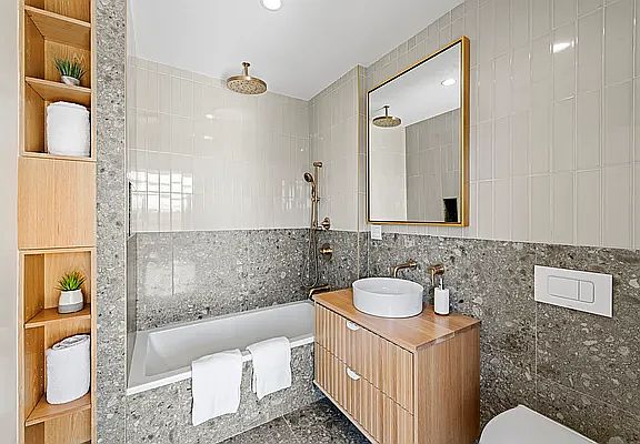 Both bedrooms sit on the opposite side of the home. The primary suite has dual exposure, a massive walk-in closet, a private wraparound balcony, and a pristine en-suite bathroom with a wall-mounted Toto floating toilet, a custom floating vanity, beautiful terrazzo floors, stylish Delta fixtures, and a deep soaking tub. The second bedroom has a large reach-in closet and easy access to a second full bathroom with a walk-in shower.