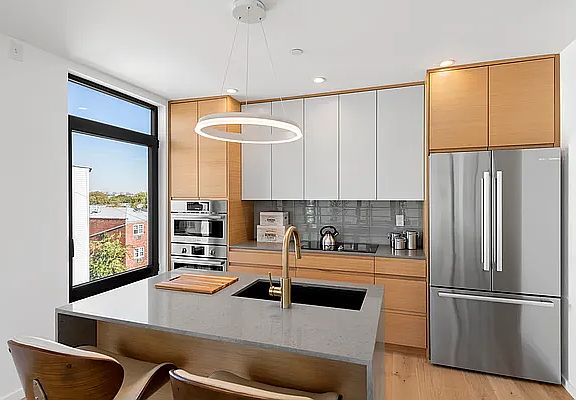 Engineered 7-inch wide plank white oak floors sit beneath airy 9-ft ceilings with recessed lighting. Double-pane windows let in an abundance of natural light and help keep interiors quiet, while Mitsubishi split-system units offer precision temperature control in each room. Additional features include Leviton smart switches, integrated Alexa virtual assistant technology, smart thermostats, and pre-wiring for FiOS and Spectrum. The home also comes with an in-unit LG washer/dryer.