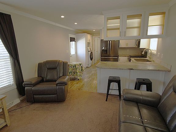 2 bedroom immaculate home located in the Crossings at Sleepy Hollow Cooperative Park. This 2021 home has an expansive deck at entry that leads into the open concept living/dining/kitchen. Kitchen has tile backsplash, glass front overhead cabinets over breakfast bar, deep stainless steel sink. GE Profile washer/dryer combo with plenty of cabinets for storage. Whirlpool fridge, 5 burner gas stove, microwave and dishwasher. Furnishings include leather living room set, lamps, tables, a full size bed in primary bedroom with box spring, closet has built-in shelving for storage. A large shed for additional storage, central air, propane heat. Pet friendly with limit of 1 dog, max weight 31 lbs. Cats must be kept inside. Property is vacant and ready for a quick closing!