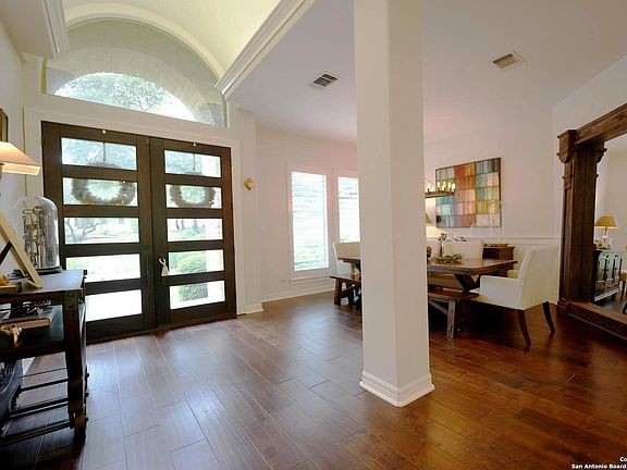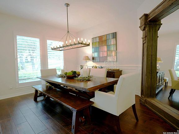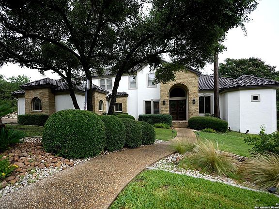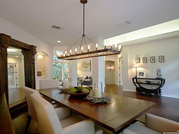 Discover this elegant Mediterranean home tucked away on a quiet street in The Dominion. The open layout features high ceilings, abundant natural light, and a chef's kitchen with custom cabinets, solid countertops, and a large island. The primary suite overlooks the pool and backyard, with a spa-like bath offering a garden tub, separate shower, and walk-in closet. Enjoy outdoor living with a covered patio, kitchen, and sparkling pool. Upstairs includes three bedrooms, two baths, and a spacious game room-the third bedroom currently serves as a media room.