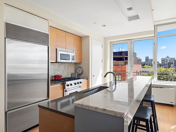 The chef's kitchen is equipped with top-of-the-line appliances, including a Viking range, a Sub-Zero refrigerator, and a large island topped with Calacatta Gold marble. A full-sized in-unit washer and dryer adds everyday convenience.