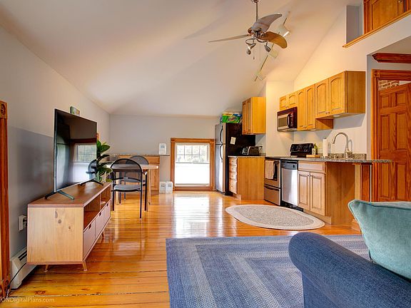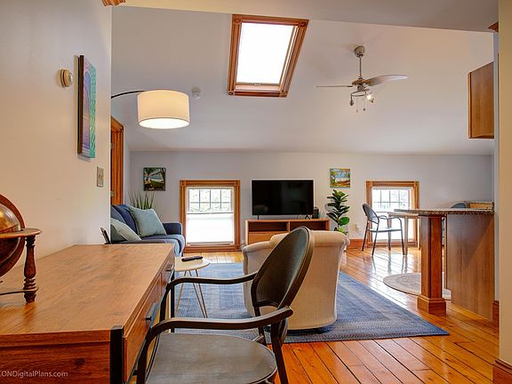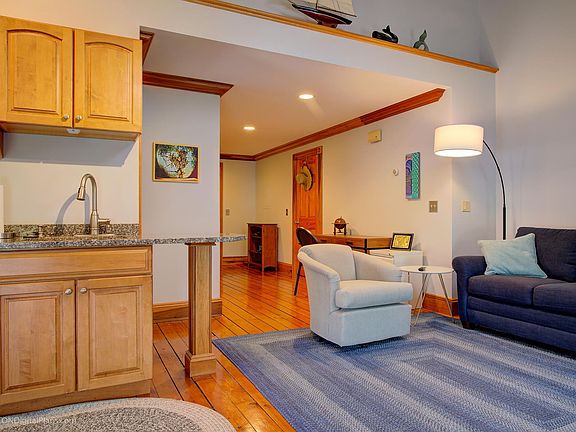 Charming 1-bedroom condo in a Victorian cottage, steps from Bellevue Avenue. Features include an open-concept living/dining area with cathedral ceilings, skylights, and a modern kitchen with granite counters and stainless appliances. Spacious bedroom with exposed brick, skylight, and two cedar closets.