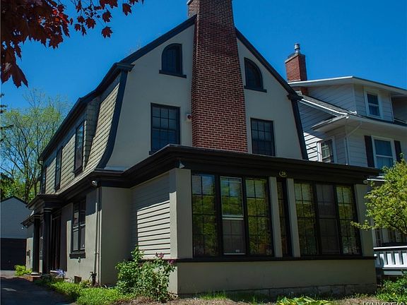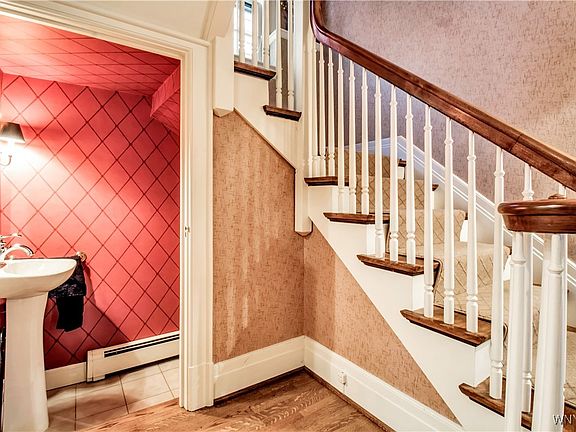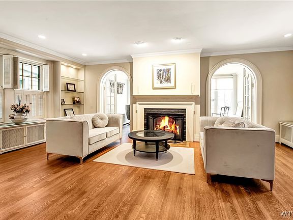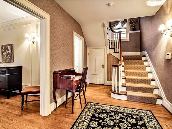 This stunning side-entrance Delaware District home has been expertly maintained and beautifully updated. The first floor offers a large living room with a wood-burning gas-fired fireplace, a bright sunroom (also with a gas-fired fireplace), a spacious dining room, a chef's kitchen with soapstone counters and an elegant tile backsplash, custom cabinetry and high-end appliances, including a Viking gas range, Sub-Zero refrigerator and a Bosch dishwasher. There is also an adjacent sitting area/breakfast room with a gas insert fireplace and glass doors opening to a concrete patio overlooking the backyard. And there is a half bath conveniently tucked under the stairs. The second floor has three bedrooms, including a large primary suite with a full bathroom and excellent storage, plus a second full bathroom and an enclosed all-season porch area with new windows. There is a beautifully finished third floor with a family room, an office or fourth bedroom, a full bathroom with a whirlpool tub, and a nearby small kitchenette area. There are split air conditioner units strategically placed throughout the first, second and third floors for added temperature control and comfort. Mechanically, there is a newer energy efficient boiler which provides hot water for taps, radiant flooring in the kitchen/breakfast room/front foyer plus cast iron radiators throughout the house. Most of the plumbing has been replaced and there has been extensive rewiring throughout. The exterior was painted in 2018 and new gutters added. The concrete driveway was replaced in 2022 and recent chimney and foundation tuck pointing was completed. The roof has asphalt shingles on top and slate tiles on the sides. There is a two car garage with an automatic door opener. Excellent Delaware District/Elmwood Village location close to Delaware Park and the AKG and not far from downtown Buffalo and the Medical Corridor.