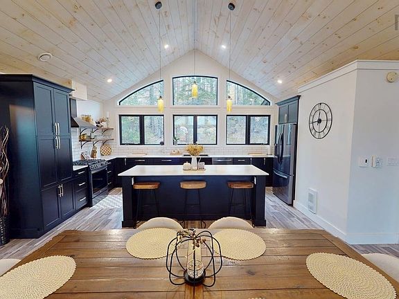 Expansive windowsStone fireplacePine board ceilingsHigh-end finishesFunctional islandBeverage fridgeFull-length covered balcony