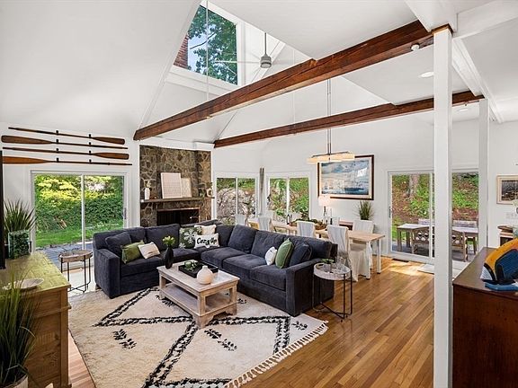 This exceptional coastal property offers deeded private access to Fluen Point’s beach, pier, and dock, providing direct entry to Salem Sound for all your favorite water activities and, co tennis court ownership, recently renovated to blend modern elegance with timeless charm, this pristine home is move-in ready. The main level features hardwood floors throughout, with a sunlit den off the kitchen, perfect for versatile use. The spacious living/dining area impresses with its cathedral ceiling, original beams, and a striking stone fireplace, while walls of windows frame views of the lush grounds. The second floor includes a brand-new primary bedroom and bath, plus a flexible office/bedroom space. The lower level offers a third bedroom and a large guest suite with a full bath and walk-in closet. Outdoors, enjoy a stunning yard with three stone patios, a huge deck, and shared access to a tennis court. Make this unique coastal retreat your own and experience the best of both elegance and na