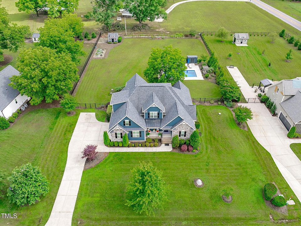 Meticulously maintained home showcases an abundance of home upgrades and updates including water purification system, home office addition, custom cabinets, hardwood flooring, septic tank cleanout, whole house and pool surge protector, exterior paint and stain, in-ground pool, and separate stamped concrete patio. If you love outdoor living and entertaining, this home provides an extra 2300+ square feet of open and shaded patio and porch space to gather and relax. Inside, the main floor living spaces can be configured to accommodate your family's needs and style with large banks of windows for swathes of natural light. Highlights include butler's pantry, two stacked stone fireplaces - 1 inside and one outside, mudroom with an organization station, and formal front room. Modern kitchen showcases a center island with seating for 4, timeless white cabinetry, gas cooktop with range hood, granite countertops, tile backsplash, wall ovens, stainless steel appliances, and a sizable breakfast nook. Spacious owner's suite showcases a bright seating area with custom shelving and access to the screened porch. Spa-like ensuite offers dual sink vanity, glass surround shower, separate free standing soaker tub, private water closet, and an oversized walk-in wardrobe. Completing the downstairs is a powder room and laundry room with sink and cabinetry for more storage. Second floor features 2 adaptable bonus rooms for a variety of uses, 2 spacious bedrooms with walk-in closets, and a guest suite with a private bathroom, and conveniently located walk-in attic storage off one of the bonus rooms. Endless outdoor living and entertainment options utilizing the covered front porch and expansive wrap-around patio, screened-in back porch with fireplace and access to the pool, garden and well-maintained green space. Pergolas shade 2 areas, 1 with attached bar seating perfect for table or cozy seating and the other offers a cozy swinging sofa. Raised beds, sheds, and mature landscaping complete this one-of-a-kind property. Brookshire Community is located south of Youngsville, just off NC 96 and less than 4 miles to US-1 making it convenient for shopping, dining, and other amenities in Franklin and Wake counties.
