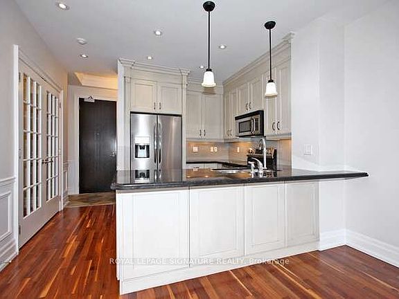 Premium 824 sq.ft. 1 bedroom + den with 2 full bathrooms in prestigious Kilgour Estate! This stunning suite features a beautiful foyer with wainscotting, double closet, 3 piece bathroom and laundry. Beautiful kitchen with stainless steel appliances, granite counters and breakfast bar. Living/dining with 10 ft. coffered ceilings, pot lights and walk-out to large east facing terrace with gas line for bbq. Spacious primary bedroom with double closet and 4 piece ensuite. Large den with french doors and pot lights perfect for work from home. Parking and locker included. Elegant building with lux amenities including gym, indoor pool, party room, library, guest suites, visitor parking, 24 hour concierge + +. Steps to spectacular ravine walking trails, TTC, Sunnybrook Hospital, shops on Bayview + more!
