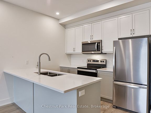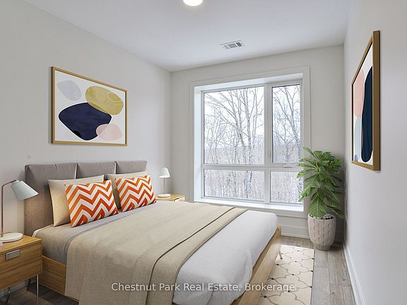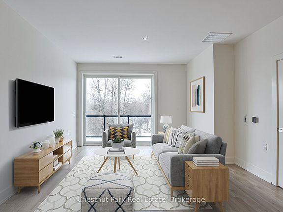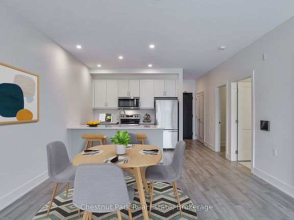 Welcome to Campus Trails, The Emily, a stunning new addition to one of Huntsville's most sought-after condo communities. This brand-new, never-lived-in 1-bedroom plus den suite offers 886 sq. ft. of thoughtfully designed living space, combining modern finishes with the natural beauty that surrounds the property. Located on the fourth floor, the unit enjoys beautiful south-facing forest views, allowing warm afternoon sun to pour in and creating a calm, inviting atmosphere throughout the day. Step inside to an upgraded kitchen featuring quartz countertops, stainless steel appliances, soft-close cabinetry, and clean contemporary styling. The open-concept living and dining area flows naturally toward the private balcony, perfect for relaxing, reading, or simply enjoying the treed backdrop. The primary bedroom offers a walk-in closet, while the den provides a versatile flex space, ideal for a home office, guest room, or hobby area. Designed as an accessible suite, the layout emphasizes comfort, ease, and functionality. This unit also includes in-suite laundry, an indoor heated parking space, and a private storage locker, adding exceptional convenience to everyday life. Residents of Campus Trails appreciate the peaceful setting, walking trails right at the doorstep, beautifully maintained common areas, and the sense of community the development is known for. Located moments from the hospital, shopping, restaurants, and Huntsville's vibrant downtown, this condo offers the perfect blend of nature, modern living, and low-maintenance comfort. Experience the best of Muskoka in a building where everything is new, efficient, and ready for you to move in and enjoy.