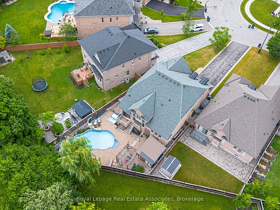 An Entertainer's Dream Home, inside and out! Nestled at the end of a quiet crescent in the prestigious Estates of Credit Ridge, this executive bungaloft is a true one-of-a-kind opportunity. Backing onto a ravine and designed with entertaining in mind, the backyard is a private resort-style retreat featuring a heated saltwater pool, hot tub, cabana with a full bathroom & shower, wet bar, and extensive hardscaping for effortless outdoor living. Inside, enjoy a 3,233 square foot floor plan of thoughtfully customized living space (plus a finished basement), with soaring ceilings, pot lights, hardwood floors, crown mouldings and radiant heated floors throughout the main level, lower level, and garage. The open-concept, upgraded kitchen and living area overlook the backyard oasis and are complemented by an additional custom bar area and loft space with an open lounge, bedroom and full bathroom- ideal for hosting. The main floor also includes a separate den/office, huge laundry room, and direct access to the garage via the mud room. The spacious primary bedroom is tucked away on the main floor with a large ensuite and walk in closets. You'll find incredible versatility in the basement, where there are two separate spaces. One side features french doors that walkout to the backyard, a large rec room, bedroom, steam room, 4-piece bath, and another custom bar while the other has a fully self-contained 1-bedroom suite with its own kitchen, private side entrance, and direct access to the side yard adding flexibility for multigenerational living or a nanny suite. With 9ft ceilings, large windows and an abundance of pot lights, the lower level does not feel like your typical basement - the projector and lots of wall space make it a great spot for movie night or watching sports events. Car lovers will appreciate the double garage with a car lift and heated floors, plus the parking for 10 vehicles in the driveway.This home checks every box- luxury, privacy, and functionality!