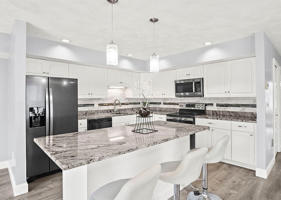 - Features: Flooring - Vinyl, Dining Area, Countertops - Stone/Granite/Solid, Kitchen Island, Recessed Lighting, Remodeled, Stainless Steel Appliances, Lighting - Sconce