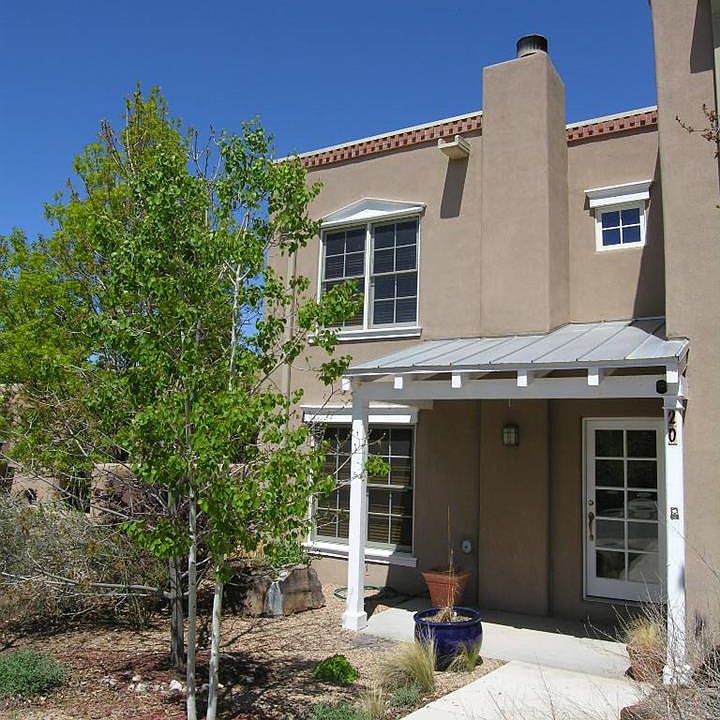 Rarely does an Aldea townhouse come on the market offering affordable living and just 10 minutes to the Plaza. This 2 bedroom/2 bath residence is light and bright with views of the Sangre de Cristos and Jemez mountains. You will find everything you need: laundry room with washer/dryer; wood burning fireplace in the living room; radiant heat; adorable kitchen that looks out to enclosed xeriscaped backyard and eastern views; front bedroom and living room face west looking out over the landscaped front yard and exposing the beautiful Santa Fe sunsets. The master bedroom has a walk-in closet with views of the Sangres and morning sun streaming in. AND there is an oversized one car garage with work area. Aldea has a friendly, neighborhood feel with easy walking/hiking right out your front door, a plaza of its own, a clubhouse, a neighborhood cafe, is an easy commute to Los Alamos and just 10 minutes to town. This property has an excellent rental history if looking for an investment. But is ready for you to move in and make it your home.