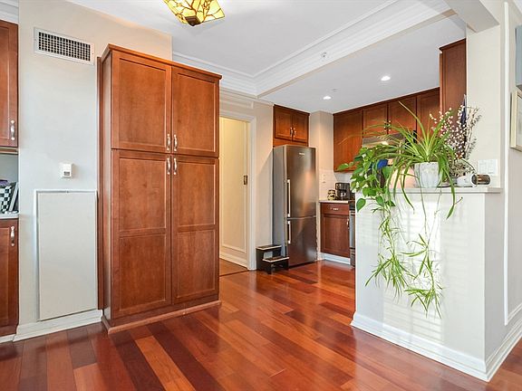 Beautiful two bed/one bath east facing residence overlooking expansive, professionally landscaped grounds and fountain now available! Open floor plan with custom crown molding and cherry hardwood floors throughout. The chef's kitchen with with stainless steel appliances is the perfect place to unwind at the end of a long day. The large primary bedroom has two closets, not including a walk-in closet directly outside the bedroom. Spacious guest bed, central air, and in-unit washer/dryer round out this wonderful unit. One valet garage space and one deeded storage unit included. Entire interior has been painted. Property sited on 4 acres across from Olmsted Park and MBTA Green Line Station (D Line) with quick access to Kenmore Square, Prudential Center, Back Bay, Midtown, MGH, Financial District, and numerous area restaurants and boutique shops. Complex has Grand Entrance Hall, 24/7 concierge, doorman, fitness center, club room, bike storage, elevators, and on-site professional management.