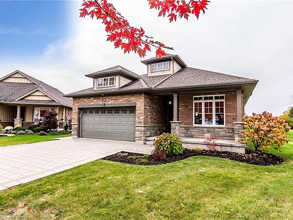Simply breathtaking...20 Cherry Blossom Lane, in the beautiful community of Orchard Park of St. Thomas is a Doug Tarry Built 3 Bed, 3 Bath Energy Star Bungalow located on a large pie shaped lot at the end of a quiet adult lifestyle cul-de-sac with no immediate rear neighbors. This handsome home offers an interlock stone patterned double wide driveway that's professionally landscaped. The exterior is draped with a rich beautiful tone of brick & stone. The covered porch captivates with a fabulous front door that welcomes you into the expansive ceramic foyer that leads you into a large open concept space that greets you with gorgeous hardwood floors, a cathedral ceiling in the great room w/gas fireplace, tasteful dining room & a large modern kitchen with magnificent vaulted ceiling w/upper window allowing plenty of natural light and texture to this already gorgeous kitchen w/sit up breakfast island & a magnificent walk in pantry! The principal bedroom features warm carpeted flooring, dbl closets and a wonderful 4 pc ensuite w/separate soaker tub & shower! Main Floor continues to surprise w/second bedroom, 2 pc bath and a laundry area with inside entrance to the garage! The lower level is finished with a large family room, 3rd bedroom, 3 pc walk in shower & workshop! Possible 4th bedroom, craft or hobby room awaits your finishes & possibilities are endless with the framed storage/games room behind the family room! Just take a look at the iguide layout provided! Off the kitchen sliders you'll find a warm invitation onto the covered porch with extended deck w/gas line bbq overlooking the yard & park that will be perfect for years of outdoor enjoyment! Other notables offered in this amazing home is central vacuum, inground sprinkler system, auto garage door opener, water softener, new fridge, stove, dishwasher, washer and dryer! Only a few minutes drive to local hospital, shops & walk to public/catholic schools and close to parks & trails. An absolute must see!