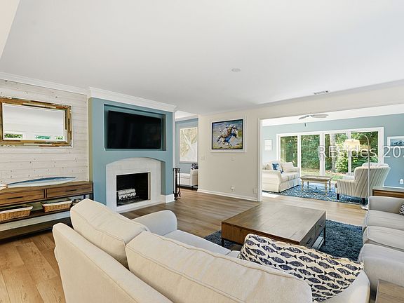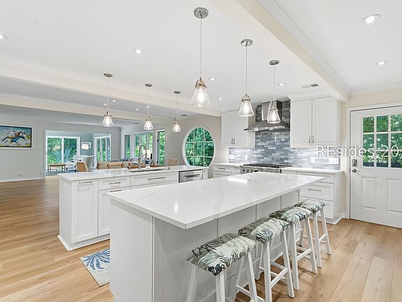 Nestled at the end of a quiet street just steps from the Bluff in Hilton Head Plantation, this beautifully renovated coastal retreat blends elegant Lowcountry design with relaxed island living. Offering roughly 4,000 square feet, this four bedroom, four bath home features a thoughtful layout ideal for entertaining and everyday comfort. Every space has been updated with quality finishes, warm natural light, and an easy flow that celebrates the coastal lifestyle.The open concept main living area includes rich wood flooring, custom built ins, and two wood burning fireplaces, including one with a blower for cool evenings. The living and dining areas connect seamlessly to the designer kitchen, creating an inviting setting for gatherings. The remodeled kitchen features dual islands, custom cabinetry, quartz countertops, and top tier appliances including a Bosch refrigerator and dishwasher, a GE Monogram gas range and oven, and a wine refrigerator.The primary suite on the main level offers a serene retreat with abundant light and a remodeled en suite bath. A second main floor guest suite ensures comfort and privacy for visitors. Upstairs, two additional bedrooms are connected by a shared den that works well for guests, office space, or quiet relaxation. Built ins throughout the home add both character and functionality. A Carolina Room extends the living space with views of the lush landscaping. Step outside to a private outdoor oasis with a resurfaced covered pool, a spa added in 2021, and a full outdoor bar. The paver patio wraps around the home for a cohesive, resort style setting. New sod, mature plantings, and an upgraded Rainbird irrigation system keep the grounds vibrant year round. One of the renovated bathrooms connects directly to the pool area for added convenience. Additional updates include new lighting, ceiling fans, fresh interior paint, keypad entry on all exterior doors, Ring doorbells, and a large garage with a stainless sink. The washer and dryer installed in 2024 are included. Experience refined yet relaxed Lowcountry living at its finest. With a perfect blend of quality craftsmanship, elegant design, and unbeatable location, this Hilton Head Plantation residence isn't just a home, it's a lifestyle.