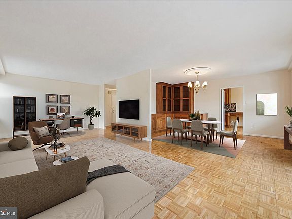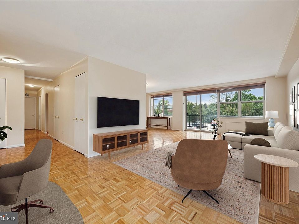 Very special home in the beautiful Trianon Co-op. Over 1700 sf of light and bright living space. Large great room opens to dining area. Galley kitchen with European-style cabinets and stone counters. Updated full hall bath for guests. Primary large bedroom with full bath. Closets galore. Parquet wood floors and new carpets. Large balcony perfect for morning coffee or an evening cocktail. The Trianon offers a luxurious lifestyle with its top-notch amenities like the front desk concierge, outdoor pool and cabanas, community room, and garage parking. Monthly fee covers so much...all utilities, all taxes, insurance, water, building maintenance, trash, basic cable, 24 hr security, on-site management. Pet friendly(restrictions apply). And that's just the beginning! Cash only purchase.