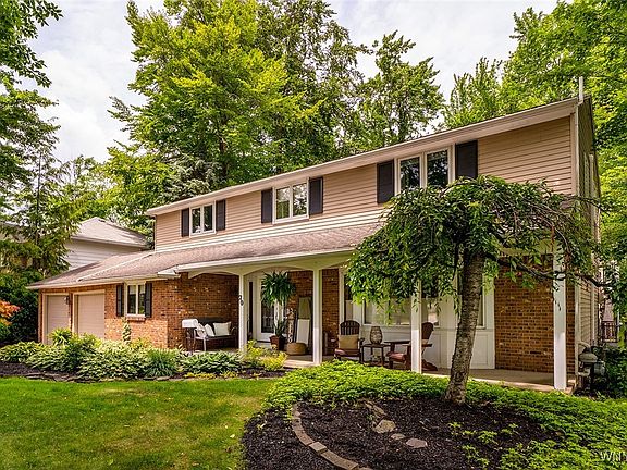 Welcome to resort living in the heart of Amherst! Move-in ready 4 bdr 2.5 bath elegant colonial in the Williamsville school district offers easy access to the town’s amenities. The bright and airy floor plan showcases an updated kitchen w/cherry cabinets, granite countertops and all stainless appliances are included in sale. Bathrooms recently remodeled for today’s lifestyle featuring a huge walk-in shower in the main ensuite. Tons of closet/storage space including a cedar closet and walk-in closets in 2 bedrooms. Experience that vacation feeling every day in the park-like fully fenced backyard which boasts a fish pond, covered deck, playset/treehouse combination, gas grill, garden shed, perennial gardens, paved walkways and a spectacular view of a neighboring natural pond. Additional assets include: 2-car attached garage, tankless hot water/baseboard heat system, central AC (2020), 1st floor laundry, hardwoods, newer carpeting, irrigation system and a dry basement w/high ceilings. Washer/dryer & all drapes/window treatments included in sale. A truly unique, spacious & exceptional property! Delayed showings begin Fri, June 20th at noon. Offers by Fri, June 27th by 5PM.