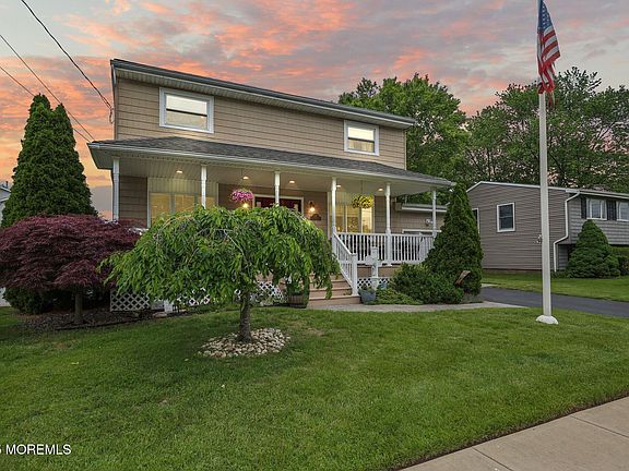 This 4 bdrm Fleetwood colonial has been loved for nearly 25 years. The beautiful covered porch w/vinyl cedar shake siding & recessed lighting welcomes you to enter into a renovated main level with top the line wood look ceramic tile flooring, new trendy kitchen with SS appliance pkg, white cabinets and black honed granite counters with peninsula island, pendant & recessed lighting and custom wine/coffee bar. Eating area is open, bright and inviting. The spacious living room is drenched in sunlight. An oak staircase leads you upstairs to 4 well appointed bdrms and main bathroom. Hardwood floors under carpeting. Primary bdrm comfortably holds king sized furniture. Your basement provides new vinyl planked flooring in the finished half and tons of storage in the unfinished half with utilities. The expansive lovingly manicured yard presents a fenced in garden, a storage shed that matches the home, Cambridge paver patio, gas line bbq hookup, fully fenced with/PVC. This home is centrally located in the heart of Hazlet on a great block with great people. Don't miss out!