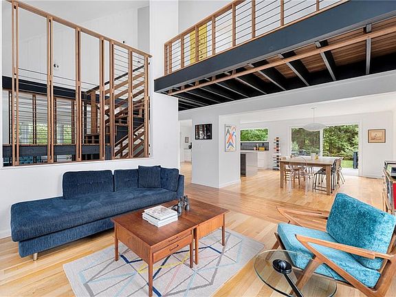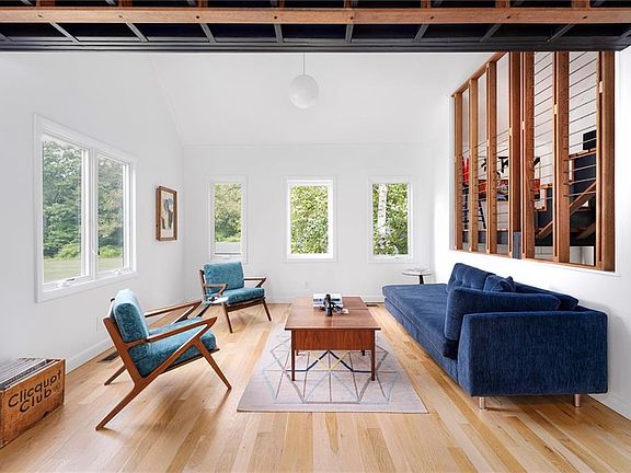 Welcome to Little Compton Modern: a private designer hideaway on 2.4 acres at the end of a quiet country road. Featured in Rhode Island Monthly (2023), this 4 bedroom, 2 bath home blends mid century modern style w/ luxury comforts. Recently renovated, the open layout features a custom teak & metal staircase, quartz waterfall island, and kitchen w/ stainless appliances. Enjoy indoor - outdoor living w/ a deck overlooking the fire pit. The expansive backyard has frequent visits from wildlife including deer and many birds. There is central A/C, an outdoor shower, tankless heating, Generac generator, and EV charger. Additionally, there is the 850 sq. ft., heated & cooled, detached garage/studio with 11’ ceilings. Currently, used as an artist’s studio, the loft above offers exciting potential for a future renovations for a guest suite or ADU. Furnishings to be included in the sale (with a few exclusions), creating a turnkey opportunity for easy move-in. It is perfectly situated one mile from town center, four miles to Goosewing & South Shore beaches, 45 minutes to Providence, and 90 minutes to Boston. This home offers peaceful coastal living with convenient access to Newport and beyond. This rare offering was designed for relaxation, inspiration, and for making lasting memories. Buyer to pay LCAT.