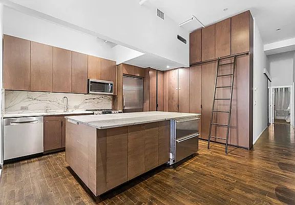 Open chef's kitchen complete with stainless steel appliance, dark maple hardwood floors and over 12 ft ceilings, oversized windows with fantastic natural light.