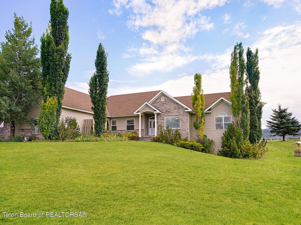 Wake up to sweeping views of the Tetons every morning in this well-built home in excellent condition. This home has a fantastic location-2 miles south of Driggs and a jaunt over the pass to Jackson. The home includes a 524 sq ft studio apartment with a separate external entrance, great for a mother-in-law suite or short term rentals. No CCRS, daylight walkout lower level, extensive irrigated landscaping, and open space living. 4 bedrooms, 4 baths, office, den, dining room sitting room, game room, oversize garage, freshly paved driveway, exterior parking, the list goes on! Two propane fireplaces, hickory flooring, newly painted rooms, lots of storage. Established farmland on 2 sizes with perfect mountain views. Plus with wood-appearance steel siding you will enjoy having no exterior maint.