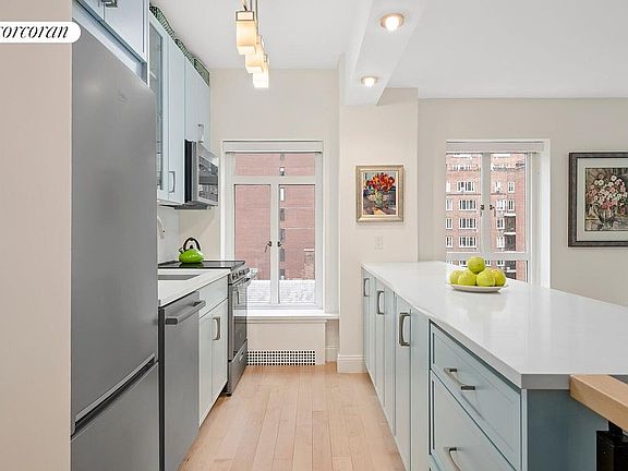 A gracious entry foyer welcomes you into a bright, serene home with open city views from every room. The sunlit, windowed kitchen offers tremendous cabinet space and has been meticulously designed for both everyday living and elegant entertaining, featuring all-new appliances — Beko refrigerator, Bosch dishwasher, GE electric range (and electric is included in the maintenance!) , Haier microwave — complemented by sleek quartz countertops and backsplash.