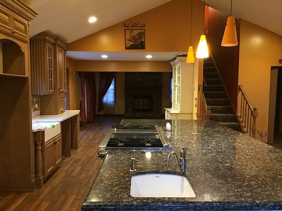 Unique home with gorgeous views of the Fox River & bike path. Open vaulted kitchen w/ huge island & built-in cook top; 42" cabinets; granite counters w french doors to patio & inground 32x16 pool w diving board; large sun-deck; Family rm w fireplace; sun/spa room w 6 person hot tub; Mste suite w private bath; Finished basement w bar & 2nd fireplace; side drive apron for boat or RV! Needs a bit of TLC but great home!