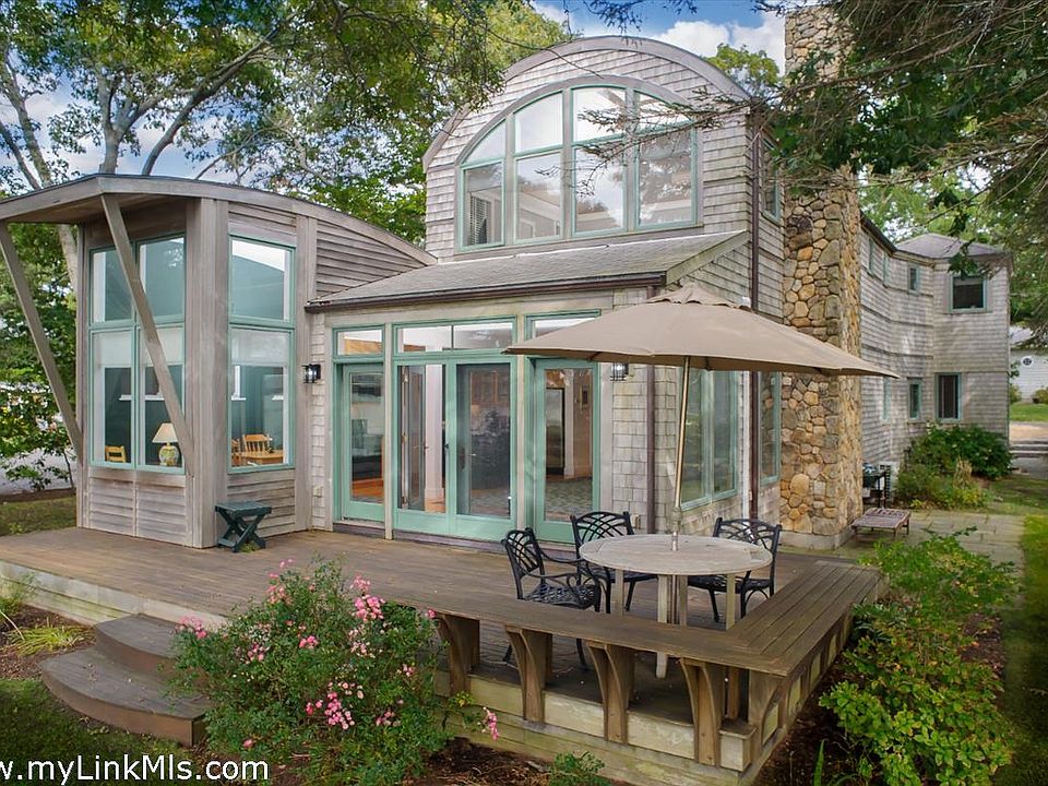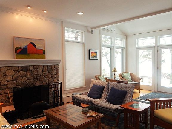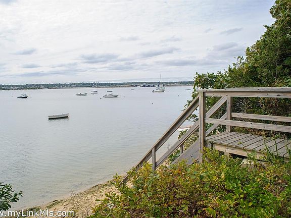 The property boasts of an expansive Lagoon Waterfront and stunning sunsets that take your breath away. There are a few steps to small beach area for sunbathing, swimming or kayaking. There is also a transfer of a mooring that is included in the sale. Buyer pays annual fee. Open floor plan includes modern kitchen with two ovens, granite counters and custom glass-front cabinets. A center-piece stone wood-burning fireplace graces the living room, kitchen and dining area. French doors lead out to the deck area for relaxing, dining, or just taking in the view. The first floor has two bedrooms and a full bath. Kitchen area also has a pantry and wide hallway leading to upstairs. The second floor primary bedroom has sweeping views of the Lagoon and shares a full bath with another room that can be a bedroom or study. Tons of closet space along the hallway.There are lovely architectural details throughout the home designed by Bruce MacNelly. This desirable location is only a little over a mile to either Vineyard Haven or Oak Bluffs. Bus line and bike paths are at the end of the road for easy access to all Island locations. Mini- splits are located throughout the home. The laundry area is located in a large basement which also houses a work area and a walk-in owners cedar closet.