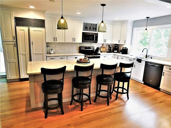 This Contemporary Style, 4-5 bedroom, 3.5 half bathroom home is nestled high on a private .78 acres near Shelter Harbor Country Club. The 3 story, 2,154 sqft. home, with an additional 1,234 sqft. walk-out basement is perfect for families of all sizes...Year Round or Summer. Main level has a wide open floor plan with newly-renovated kitchen, quartz countertops, dining area, vaulted ceilings and balcony with sliding glass doors overlooking the backyard. The fenced in backyard venue features an in-ground pool, grilling area with sitting area, fire pit and large patio... perfect for entertaining and/or family fun. Large master bedroom on 2nd level and guest bedroom both include balconies overlooking the pool with distant views of Block Island. This home has it all. Home comes fully furnished (bed/bedroom furniture, living room couches, dining room table & chairs, stools, outdoor furniture & grille, ping pong table, exercise equipment, paddle boards, etc.). Located near area beaches, but privately situated on a private road, this home is perfect for a year-round or Summer Home in Westerly, Rhode Island.