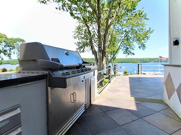 Huge dockSweeping lake viewsWall to wall slidersOpen floor planLarge wrap-around patioThree bar areasBuilt-in patio grill