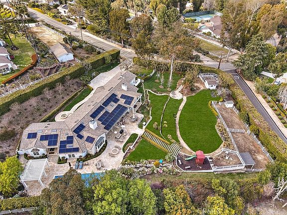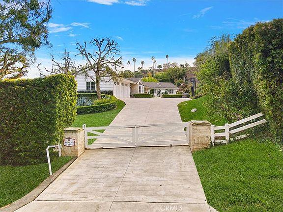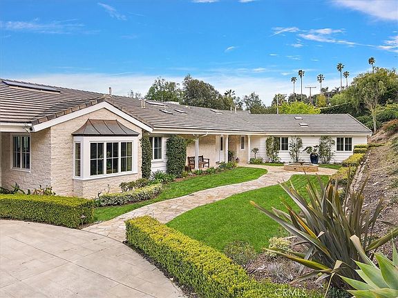 This stunning ranch-style home was built from the ground up in 2005 and is situated in the highly sought-after guard gated community of Rolling Hills. Constructed to the highest modern-day standards, this impressive home boasts soaring ceilings, wide hallways, and a functional floor plan that is complemented by walls of glass offering breathtaking east-facing city light and harbor views, as well as stunning sunrises. Upon entering the estate through an electronic gate, you'll find yourself surrounded by 1.5 acres of completely fenced and landscaped property, providing a peaceful sanctuary away from the hustle and bustle of the outside world. The property features sprawling lawns, a serene pool complete with multiple waterfalls and a covered cabana, quiet sitting areas adorned with fountains, playground, and even a charming farmyard that once housed chickens, bunnies, goats, along with corrals for horses or ponies. Inside the home, you'll find a warm and inviting interior that exudes elegance, with imported French limestone floors and solid walnut distressed floors, as well as open-beam and coffered ceilings. The home was professionally decorated and designed with every room boasting timeless elegance, from the custom drapes and wallpaper to the imported handmade tile in the bathrooms. The kitchen was completely remodeled in 2019 from a chef's point of view and features marble countertops, commercial-grade ovens stove, and refrigerators, as well as a large walk-in pantry with a priceless 18th-century French pharmacy door made of leaded glass. The kitchen also features an eating area that opens to the great room, which boasts vaulted ceilings, a cast-stone fireplace, and large windows offering stunning views. The spacious dining room is perfect for hosting large dinner parties, while the well-thought-out floor plan includes a private office, guest suite, and an additional four bedrooms in the family wing. The master suite is spacious and boasts his-and-her walk-in closets, vaulted ceilings, a fireplace, and an elegant master bath that was also remodeled in 2019. The master bath features heated floors, a freestanding soaking tub, gorgeous tile, double sinks, and a vanity area, as well as French doors that open to the pool and spa. Last but not least, the home's phenomenal game room basement is the ultimate entertainment space, complete with a large bar, wine cellar, and theater area, all featuring 12-foot coffered ceilings & Murphy Bed. Solar installed.
