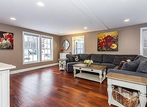 Great Pawtucketville location! This well maintained 3 bedroom, 2.5 bath Colonial is set on a wooded lot in one of Lowell's most desirable neighborhoods! Featuring a welcoming farmers porch, front to back living room, gorgeous kitchen with stainless steel appliances and an island, dining area with slider leading to the deck, and a newer half bath with wainscoting and tile. There are 3 bedrooms and 2 full baths on the second floor. The spacious master bedroom has a cathedral ceiling, his/ hers closets, and the master bath. This home also has hardwood floors, recessed lighting, central A/C, sprinklers, security system, pull down attic, and an attached garage. The walk out lower level is partially finished with a media/play room, laundry area with sink, and plenty of storage space. All this plus easy access to the Lowell/Dracut State Forest, UMass Lowell, commuter routes, schools, and shopping.