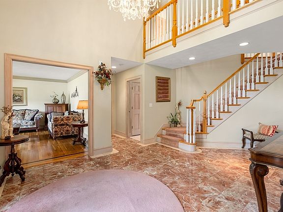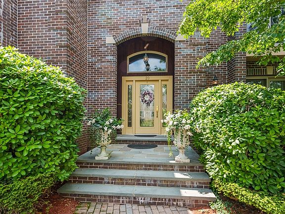 Nestled in the serene Fox Hill cul-de-sac, this brick-front French Normandy home sits on a park-like lot adorned with pristine mature trees and plantings. As you enter the marble two-story foyer, a balcony overlook from above creates an impressive first impression. To the right, you'll find the formal dining room, and to the left, the living room, both featuring French doors leading to exterior balconies. The skylighted first-floor primary suite, complete with a luxurious bath, offers a tranquil retreat or a perfect guest area. The fireplaced family room, with its tray ceiling and two French doors, provides seamless access to the new three-level composite deck, ideal for outdoor entertaining. The spacious kitchen includes a separate dining area and a half bath, completing the main level. Ascend the staircase to find three bedrooms and full bath. Additional bonus space can be found on the third level features and finished walk-out lower level. Close to the town pool/recreation area!