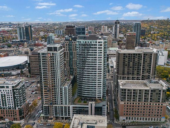Experience upscale urban living in this beautifully designed, spacious, luxury apartment at20 George Street, one of Hamilton's most desirable addresses. This contemporary high-rise offers a perfect blend of sophistication, convenience, and comfort - ideal for professionals seeking a stylish home base in the city's vibrant core. Step inside this spacious 870 squarefoot, 2 bedroom, 2 bathroom open-concept suite featuring floor-to-ceiling windows that flood the space with natural light and showcase breathtaking city and escarpment views and lakeviews. The sleek modern kitchen is equipped with stainless steel appliances, quartz countertops, plenty of cupboard space and elegant finishes throughout. You'll feel like a king looking out at the stunning southeast views over the city and beautiful escarpment from two spacious balconies. Ensuite bathroom features vanity with double sinks. Lots of storage space, in-suite laundry, and custom blinds. Unwind at the end of the day in the premium building amenities including a state-of-the-art fitness centre with yoga room, rooftop terrace with BBQs, party lounge with pool table, meeting room/boardroom, bike storage and more. Parking available for additional $150 per month or $200 per month plus hydro for EV.Live in the heart of it all! Steps to Hamilton's vibrant restaurant and arts scene! You're minutes to James St S. shops and restaurants, Go station, St Joseph's Hospital, McMaster University Downtown Centre, Jackson Square, FirstOntario Centre, the Art Gallery of Hamilton,403/QEW highway access, and HSR Public transportation. Easy access to Bruce trail,Hamilton's waterfalls and Harbourfront parks. Whether you're a busy professional, medical resident, or executive seeking convenience and class, 20 George Street offers a truly elevated lifestyles in the Heart of Hamilton's ambitious downtown core!