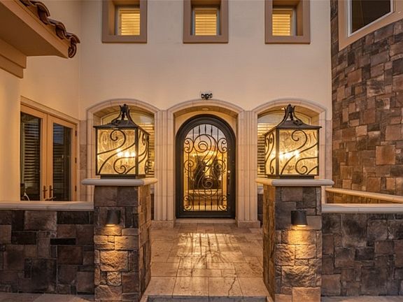 Direct golf accessDual vanitiesCovered patioCustom iron staircaseSoaring ceilingsGrand entryGourmet kitchen