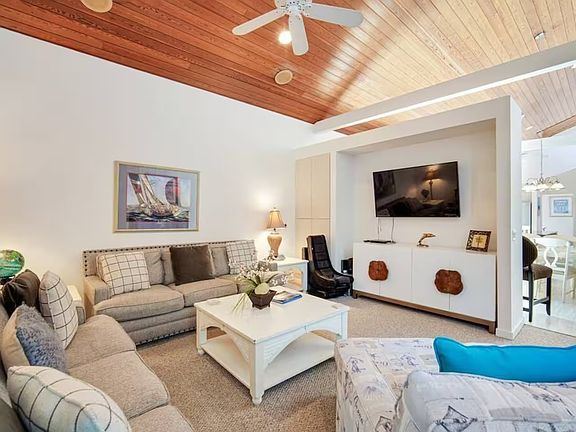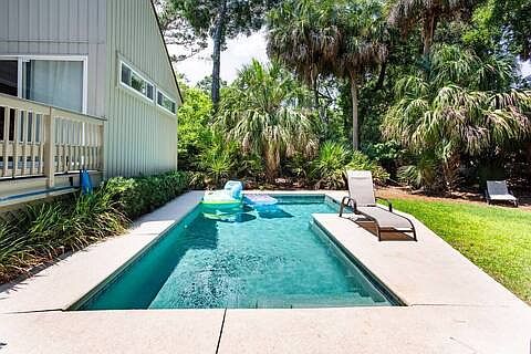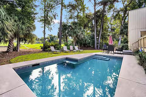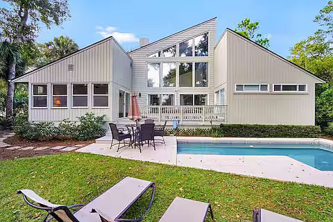 We are here to make this the best stay you have had on Hilton Head Island. Bring the whole family to this great home with lots of room for fun. The main level features an open floor plan with the living area, dining areas, and kitchen transitioning into an impressive great room illuminated by three-story windows offering views of the Fazio Golf Course as well as your private heated pool. The well-equipped, full kitchen boasts stainless steel appliances and a large island.