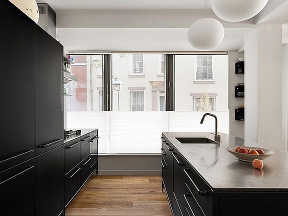 The home, previously featured in the style and interiors magazine Domino, has been outfitted with a sleek matte black kitchen from the Danish design company Vipp. The expansive living and dining areas offer a coveted combination of space, light, and views, with an undeniable connection to this charming pocket of Brooklyn Heights.