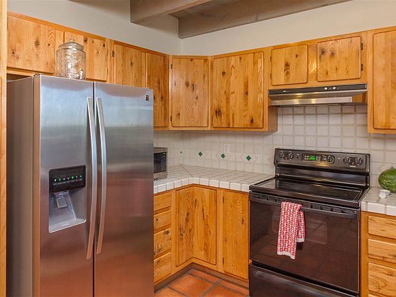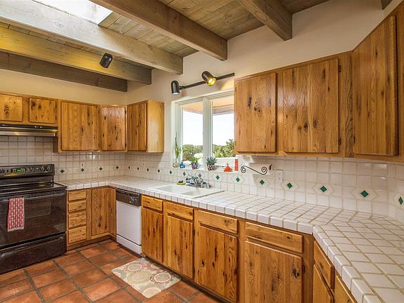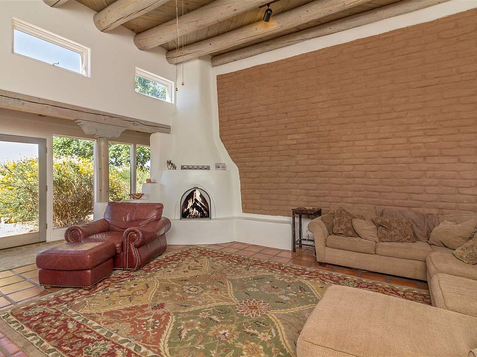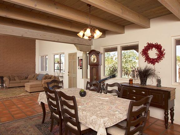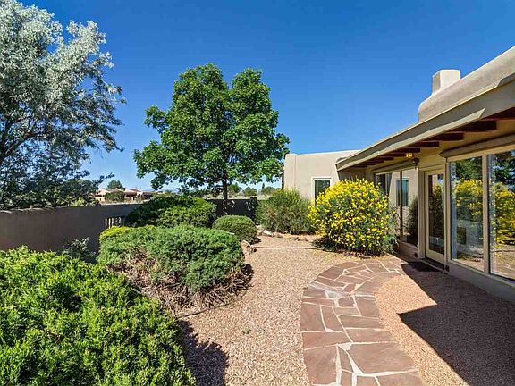Set back from one of the few paved roads in Eldorado, this true passive solar home is a private, serene and quiet retreat. Dramatic great room features exposed real adobe trombe walls, high viga ceilings and saltillo floors. Four new heat/ac splits installed in 2017. New stucco in 2011, new roof in 2009. Spacious master has viga ceilings and a wood burning kiva fireplace. Bonus small study/computer area. Finished 2-car garage. NO STEPS. Eldorado amenities include pool, parks, miles of walking trails, 4,000 acre nature preserve, clubhouse and yes you really can see the Milky Way.