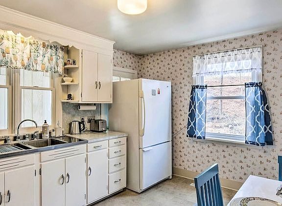 This home features two main-level bedrooms with built-in closets and an updated full bathroom with an oversized shower and glass doors. The bright eat-in kitchen includes a farmhouse-style double sink, updated vinyl flooring, and all appliances. The spacious living room showcases exposed beams, a panoramic window with golf course views, and original hardwood floors under the carpeting—ready to be beautifully restored.