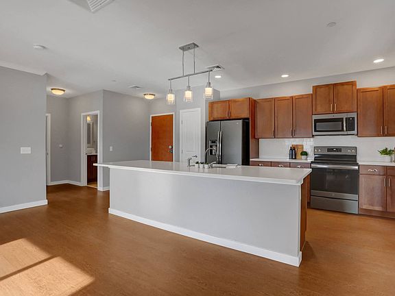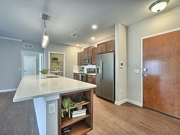 Slate appliancesIn-home washer and dryerKitchen islandLuxury vinyl plankWalk-in closets