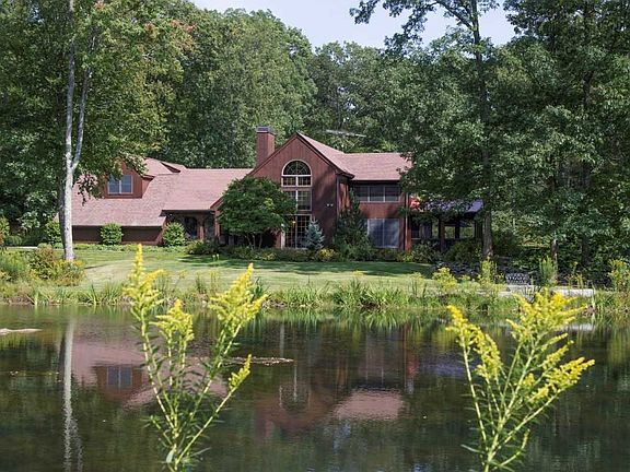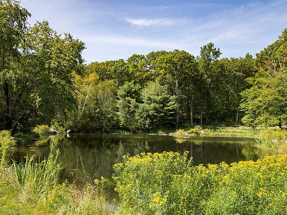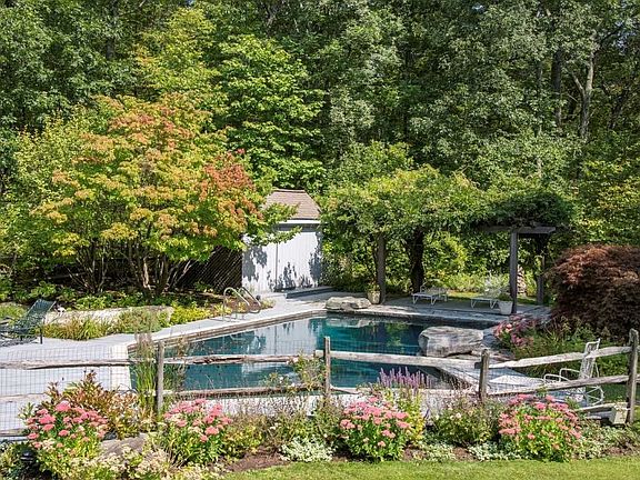 PRIVATE COUNTRY SETTING - Experience privacy and peace in Sharon on over 4 acres of gorgeous landscape, beautiful gardens, and a natural spring fed pond which is home to amazing wildlife. Features of this 4 bedroom home include a sun drenched living room with floor to ceiling windows overlooking the pond and gardens a stone fireplace with built in shelves. The eat in kitchen opens into the family room with a fireplace flanked by built in bookshelves and cabinets there are 2 sets of sliding glass doors leading to the deck which overlooks the pool and provides space for outdoor dining. A custom library with built in desk leads to the sun room. Enjoy sitting on the screened in porch or poolside under the wisteria covered pergola. This property has the ideal combination of style and comfort.