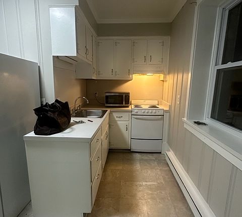 - Exterior features: Garbage included in rent, Heating not included in rent, Heating system: Baseboard, Large eat in kitchen with storage closet, Large entry hall for additional space with coat closet, Sewage not included in rent, Solid wood cabinetry in kitchen, Spacious bedroom with double closet, Spacious living room, Tiled shower/tub combo, Vanity & toilet, Water not included in rent, Will be freshly painted a nice, neutral gray with bright white trim