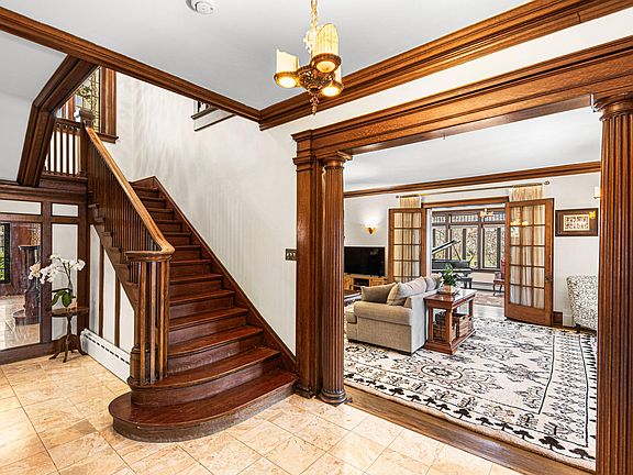 Magnificent 3 story brick home, built in 1914 and updated for modern living. From the moment you enter the grand foyer, you'll be captivated by the craftsmanship and architectural details that define this spacious residence. Offering beautiful woodwork, including elegant fluted columns, intricate molding, and hardwood floors, as well as many original light fixtures. Sunlight dances through the 13 stunning stained glass windows throughout the home, creating an atmosphere of timeless artistry. The gracious formal living room features an updated gas fireplace flanked by charming built-in bookcases. French doors open to a bright and inviting sunroom, providing seamless access to the welcoming front porch - perfect for enjoying the neighborhood ambiance. The formal dining room, boasts a beamed ceiling and a beautiful built-in china cabinet with intricate stained and leaded glass doors. A convenient pantry leads to the large, bright, updated eat-in kitchen, a culinary dream with new dble wall ovens, sleek cooktop stove, durable solid surface countertops, and a stylish marble backsplash. Ascend the grand staircase, highlighted by a stunning large stained glass window, to the second floor. Here you'll find four generous bedrooms, including one with a cozy gas fireplace and another boasting an attached playroom/office - ideal for flexible living. The third floor offers a comfortable family room, an updated bathroom, a practical cedar closet, and the fifth bedroom, providing privacy and space for guests or hobbies. The dry basement expands your living space with an additional rec room, a dedicated laundry area, workshop, and ample storage. Outside, enjoy the convenience of a 2-car garage and a private fenced-in backyard, perfect for outdoor enjoyment with a charming fire pit and mature landscaping. This exceptional home has many updates, including a high-efficiency boiler, new HW heater, a newer roof, professional tuckpointing, fresh painting, and enhanced landscaping.