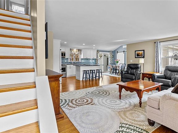 Charming oversized ,updated Cape in desirable Frerichs Farm neighborhood. Gorgeous hardwoods throughout feature a spacious bright open floor plan including living room, kitchen with granite island/countertops and dining which leads to back sliders and stone patio. First floor bedroom along with updated bath and convenient laundry/study room. Second floor features classic decorative landing along with two bedrooms and an additional bath. Lower level is completely finished and includes eat in kitchen, bathroom, bedroom, separate laundry and walks out to good sized fenced in yard with shed. Recent roof, siding, windows, electric combined with ceiling fans, solar panels and mini split add to the overall efficiency of this home. Peaceful sunsets overlooking the Kickemuit River add to the overall serenity of this area not to mention the location that is off the beaten path yet close to it all!