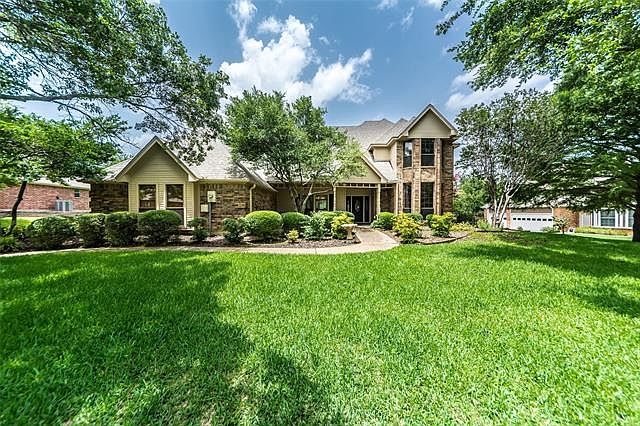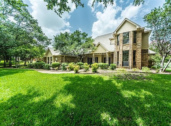 Rare find with large trees, front porch, Saltwater Pool and spa on a half acre in Lovejoy ISD. One way Security guarded entrance and exit out of the Community. Warm welcome with the Brick ceiling foyer,Hardwood through out the first floor,Game room with bay window,Wet bar and built-ins. Dining room has Brick wall with Tray ceiling. Kitchen has beautiful wood cabinets with built in for displaying dishes,vaulted ceiling,skylight,brick accent wall behind the 5 burner gas stove with double ovens. Breakfast room includes see through fireplace to living room with great views of the backyard oasis. Enjoy the Spacious Master bedroom and bath with separate vanities,stone floors,garden tub,and stain glass windows.