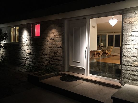 Mid-Century Modern with many extra features: granite facing and solid redwood cladding, granite walkways and patio, granite chimney, blue-white marble wall in living room with inlaid green marble fireplace, slate floor in sun room, solid walnut paneling in family room, and three ornate glass chandeliers.