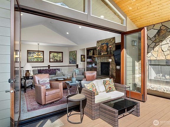 Enjoy luxury living at the lake from this custom home with panoramic views of Lake Whatcom and the mountains—ideally located in Sudden Valley’s coveted Gate 1, steps from beaches, marina, and lakefront dog park. A stunning setting for entertaining, the vaulted great room with bi-fold doors opens to a large deck with stone fireplace—seamlessly blending indoor-outdoor living. The chef’s kitchen features double ovens, a large island, farmhouse sink, and walk-in pantry. French doors lead to an office with a cozy balcony. The first floor with 2 bedrooms, living room, and kitchenette is ideal for guests or multi-generational living. Elegant curb appeal with soaring rooflines, stone accents, and paver drive to an oversized 28'x28' garage.
